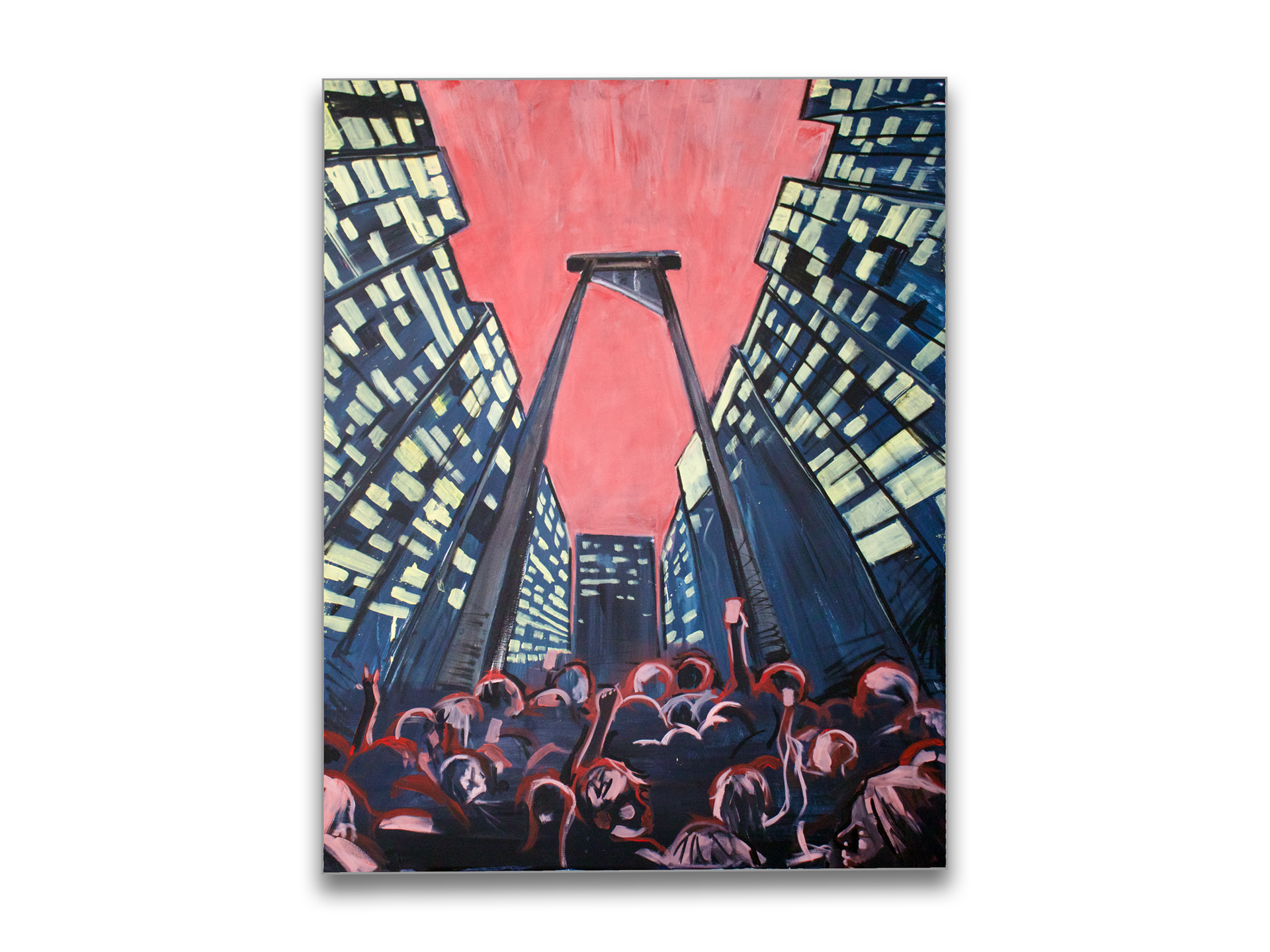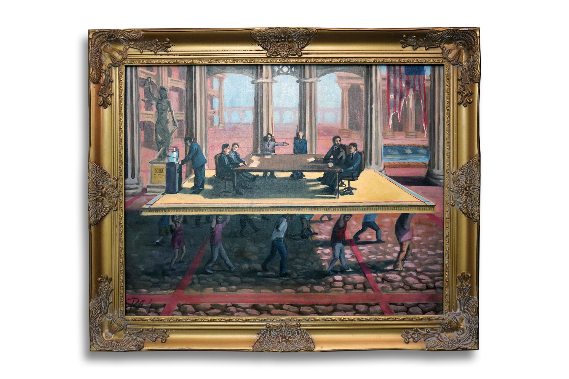 Inspired by the grandeur of ancient depictions of the Roman Empire, this painting delves into the intricate power play within the modern corporate realm. Here, shadows cloak the toiling workers while the elite class, reminiscent of emperors, convene to deliberate over profits and revel in their opulent luxuries. It's a visual narrative that echoes the timeless struggle between the masses and the privileged few, inviting viewers to ponder the dynamics of authority and inequality in our contemporary society.