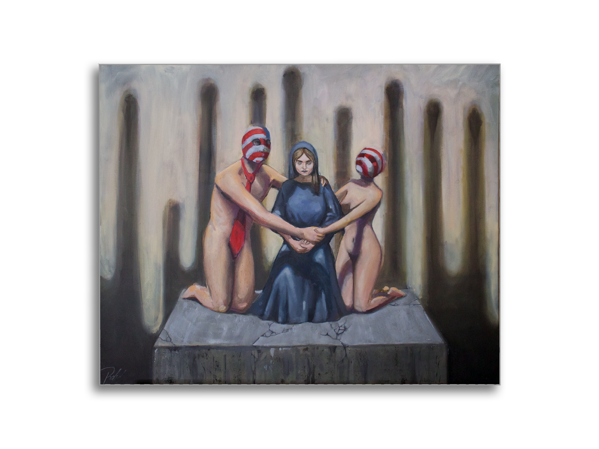 Two figures, their heads veiled in secrecy, dominate the scene as they embrace a woman dressed in mourning attire. While the man exudes an air of false authority, his gaze penetrating the darkness, the woman remains shrouded, with a slight lean away. The crumbling platform beneath them serves as a metaphor for the precarious foundation upon which this relationship is built. In 'Illusions of Welcome,' the artist challenges viewers to interrogate the dynamics of power and deception, urging us to question the authenticity of those who claim to lead by example. Through haunting imagery, the painting serves as a cautionary tale against the allure of false promises and the dangers of misplaced trust."