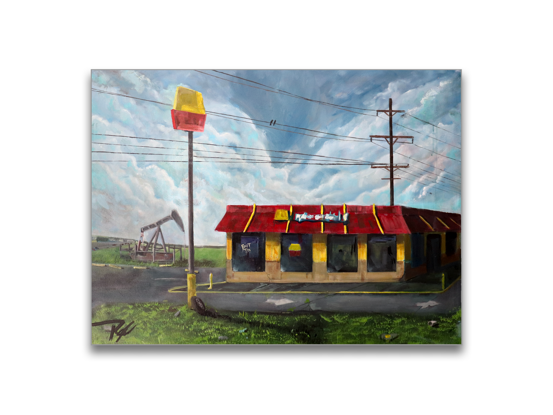 The canvas unveils the poignant tale of a once-beloved, now-shuttered restaurant, its essence saturated with the memories of yesteryears. Here, the landscape tells a story of transformation, where the familiar terrain has yielded to the allure of oil production, marking the passage of time with its irreversible changes. Amidst the remnants of what once thrived, the bones of the establishment stand as silent witnesses to the bygone era, evoking a bittersweet nostalgia for moments cherished and lost."