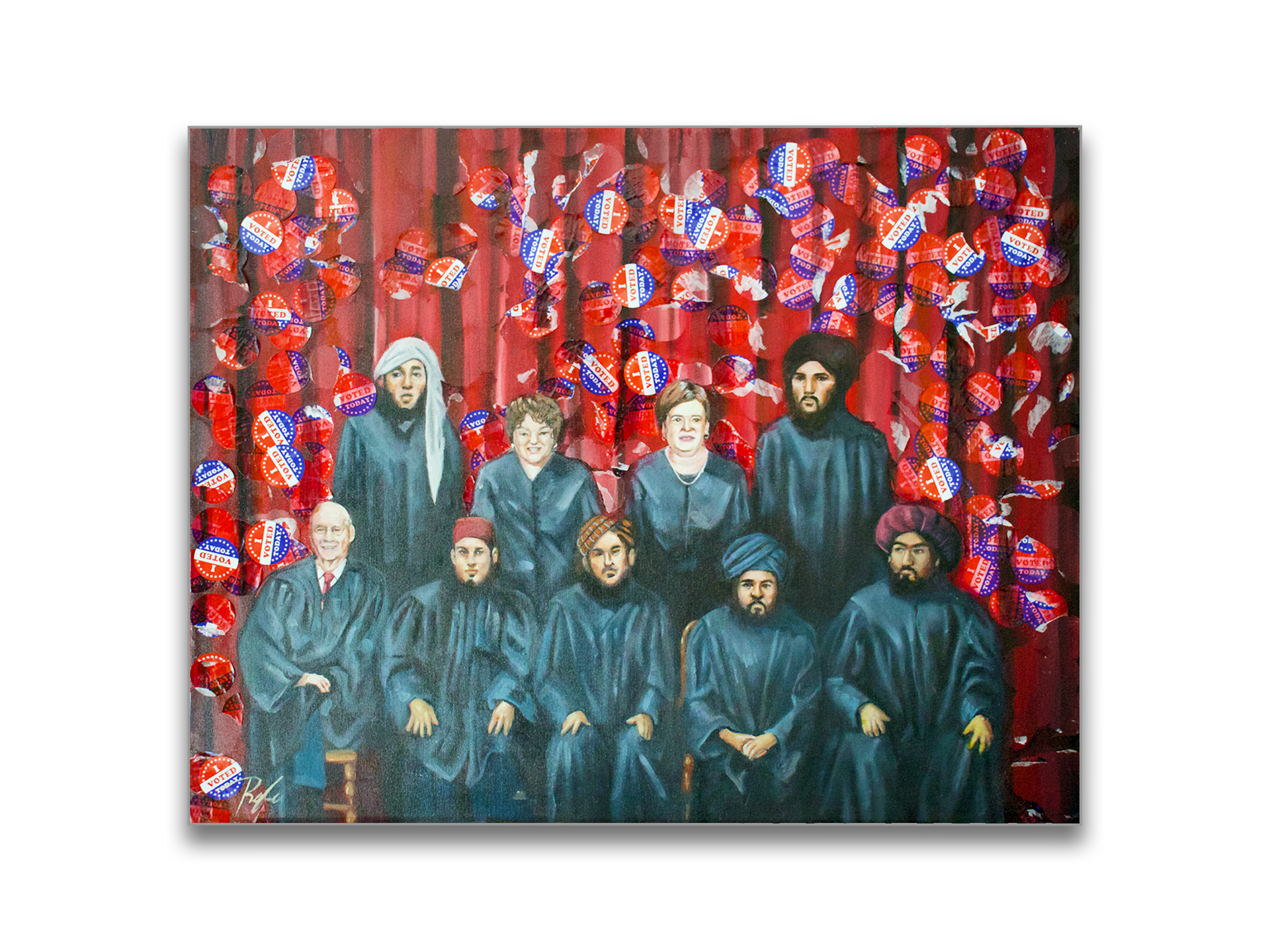 In 'I Voted Today' the canvas becomes a stage where the echoes of democracy reverberate amidst torn remnants of 'I Voted Today' stickers. Here, the Supreme Court members stand with the Taliban members. A once symbol of justice and freedom now just a ghost evoking the shadows of authoritarianism and oppression. Through a haunting juxtaposition of imagery, the artist invites viewers to contemplate the fragile balance between freedom and tyranny.