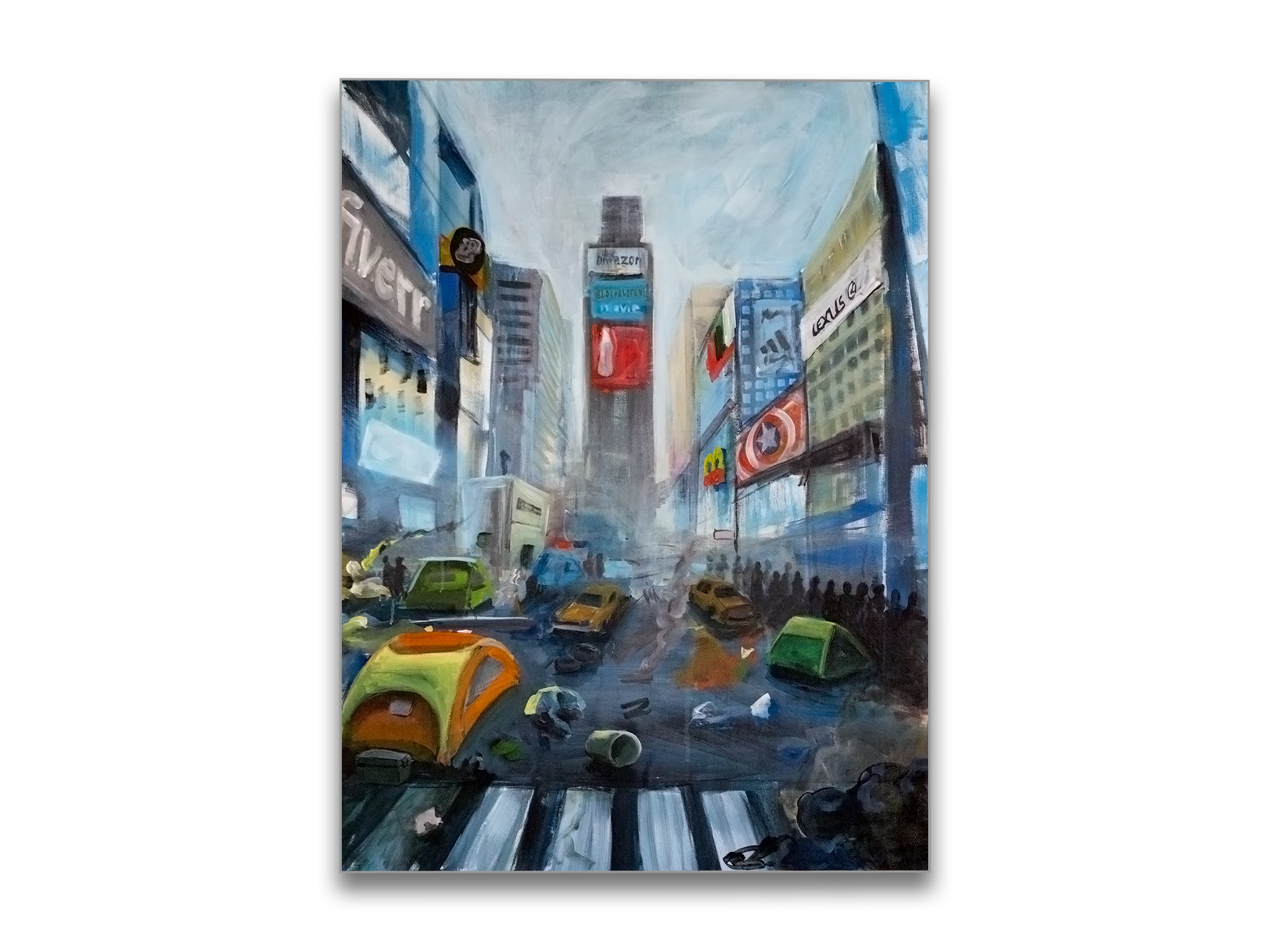 Amidst the towering edifices of Times Square, 'Drowned Voices' paints a stark picture of societal imbalance. Here, the cacophony of consumerism drowns out the silent struggles of the homeless, who find themselves adrift in a sea of indifference. In this poignant portrayal, the artist lays bare the harsh reality that confronts the disenfranchised, where the relentless pursuit of profit leaves no room for compassion or empathy.